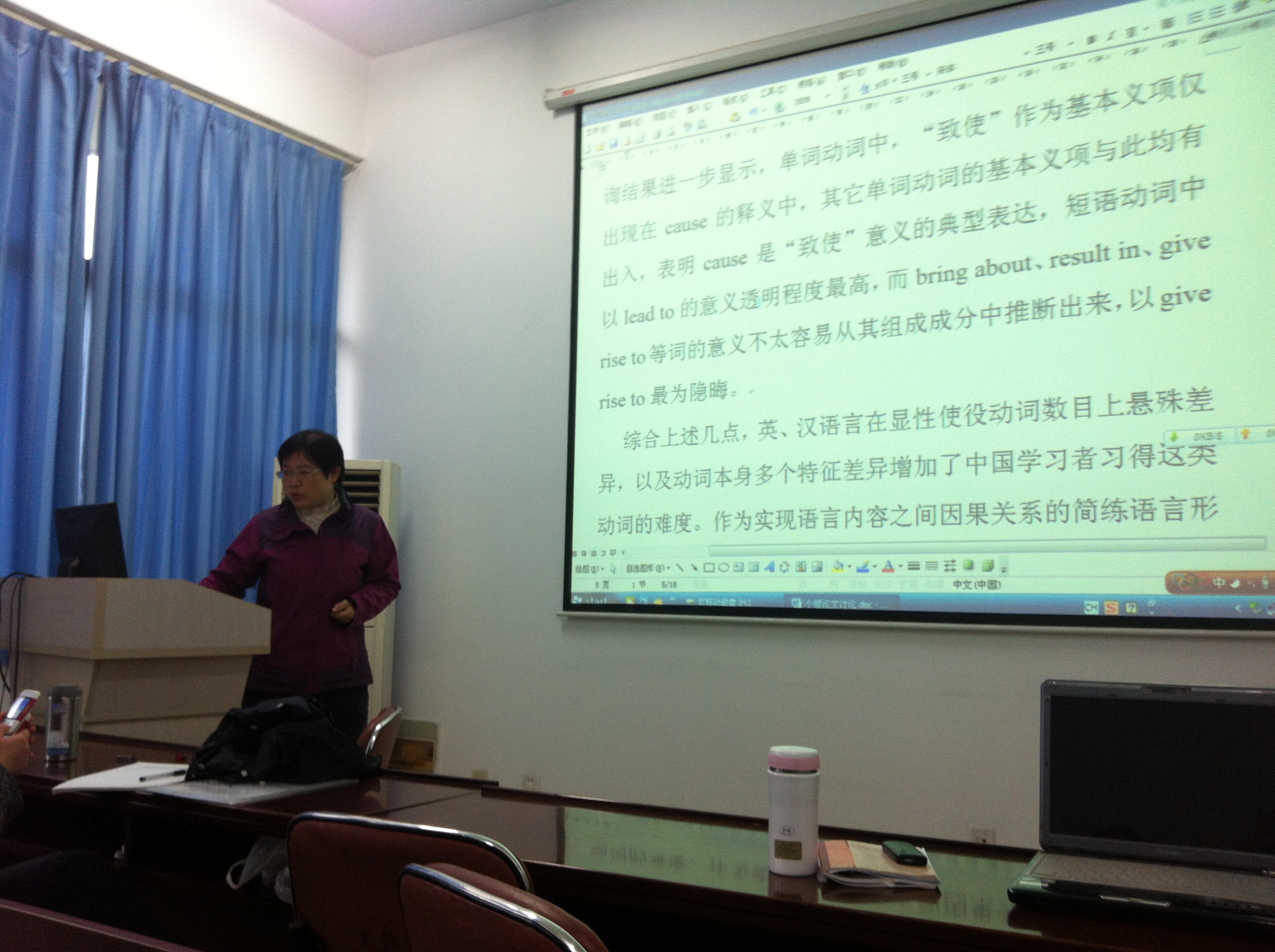 随后秦朝霞老师与大家交流了她的论文“基于语料库的中国学习者英语书面语中的使役动词使用特征研究”,秦老师通过频率数据分析发现学习者倾向于对一些早期习得词项过度运用,对较晚阶段习得的近义词项则运用较少,通过对部分词的语境检索发现学习者对搭配行为、语义韵等词汇知识表现出一定程度的缺失。随后参加研讨会的老师分别对论文的修改提出的了自己的意见和建议。
