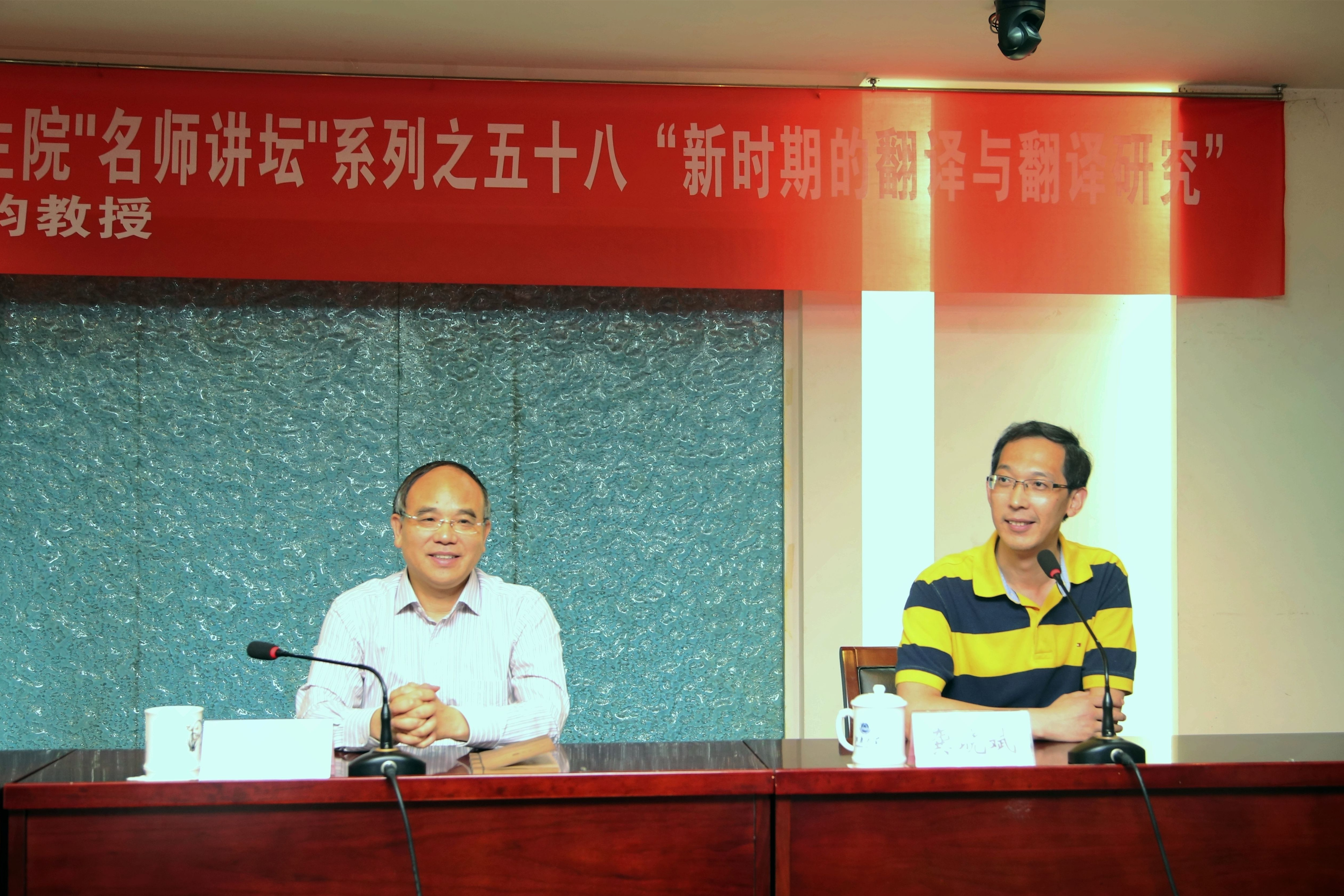此次“名师讲坛”由教育部特聘教授、国务院学位委员会第六、七届外国语言文学学科评议组召集人、全国翻译硕士专业学位教育指导委员会副主任、中国翻译协会常务副会长、南京大学学术委员会副主任、博士生导师、我国著名的法国文学翻译家与研究专家许钧教授主讲,许教授所结合自身从事翻译实践与研究的亲身经历作了题为“新时期的翻译与翻译研究”的报告。