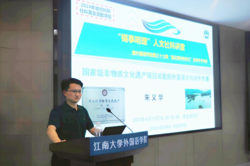 君金报告厅举行。本次讲座由朱义华老师主讲,受到了2024年省社科联社科普及项目资助,同时也是2024年江南大学《英语口笔译》基层教学组织示范建设点、2024年江南大学“教学名师工作室”培育项目支持活动,吸引了全校众多师生,尤其是英语专业师生、文化研究者前往参加,共同探讨吴歌的外宣译介与对外传播。