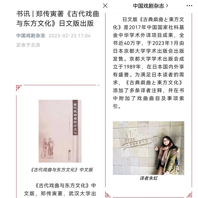 《古代戏曲与东方文化》中文版,郑传寅(武汉大学艺术学院二级教授)著,国家社科基金项目最终成果,国家“十一五”重点规划选题,是系统考查中国古代戏曲和东方文化关系的学术专著。该著作将中国古代戏曲置于东方文化的宏阔背景之下进行观照,在与日本、越南、朝鲜半岛传统戏剧的比较中概括中国古代戏曲的特点,发掘其东方文化蕴涵。《古典戯曲と東方文化》是其日译版,也是2017年国家社科基金中华学术外译的项目成果。日文译本近40万字,译者在原著的基础上进行了适量删减和部分修正。由于书中引用了大量古代戏曲唱词,读起来颇为晦涩难懂,为了满足日本广大戏曲爱好者的需求,译者在翻译过程中添加了诸多名词概念注释,并在书中附加了戏曲曲目及事项索引,具有较强的普适性及可读性。该译著于2023年1月由京都大学学术出版会正式出版发售。京都大学学术出版会成立于1989年,隶属日本国内最高学府之一的京都大学,依靠本校雄厚的教学和科研力量,出版了大量高水平、高质量、适应多层次需要的人文社科类专业书籍,在日本国内外享有盛誉。