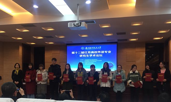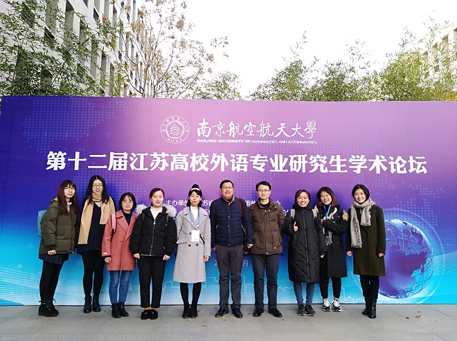 2017年12月8至10日,由江苏省高等学校外语教学研究会和江苏省高校外语专业研究生学术论坛组委会主办,南京航空航天大学天美娱乐官网 承办的第十二届江苏高校外语专业研究生学术论坛在南京航空航天大学举行。省内高校160余名博士、硕士研究生及其领队教师汇聚一堂,天美娱乐 16级研究生马小越、邱思佳、孙培培、王坤淼、谢婷婷、余婷婷、张芮和17级研究生潘婧在朱义华副院长的带领下参加了此次论坛。