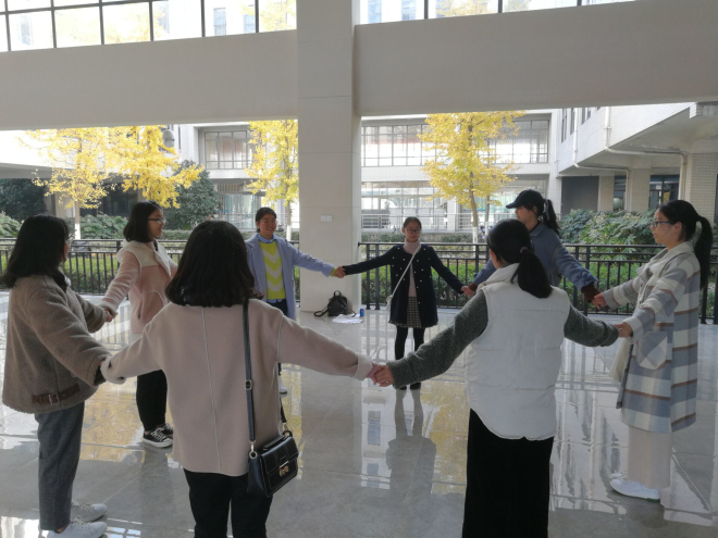 第四项活动为户外拓展。在院学生会生活部的组织下,同学们在第二教学楼附近空地开展了两个小游戏:“情有千千结”和“互帮互持”。游戏环节中,新生们都十分认真投入,虽然游戏本身是紧张的,但是场上充满了欢声笑语,十分热闹融洽。