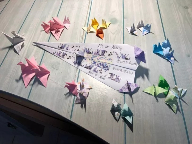 此次活动为期一个月时间,分为4个阶段4项活动,第一项活动为“纸鸢传心——折纸交流活动”。每位同学利用自己寝室和身边无用的纸、宣传单或是明信片,在上面写上自己喜欢的一些句子或发生的有趣的事,写完后将其做成千纸鹤等折纸手工造型。该活动让新生们体会了分享的快乐,在折纸的过程中锻炼动手和创新能力,在分享句子和心事的同时收获小激动和生活的小确幸感,同时在与同龄人的交流中能够了解到同龄人的想法及观点。