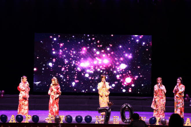 温暖大家庭的温馨氛围,同时表达了各位老师对同学们的衷心祝福和殷切的期望。接下来十三个节目依次精彩呈现,古风舞蹈《清平乐》舞步优美,极具中国风的优雅与端庄;小品《我是李焕英》既有风趣幽默,也有温情动人,演员精彩的表演让我们在欢声笑语中体会到真情的价值;八协音乐社带来改变歌曲《八月十五忆吃面兄弟》,年轻富有朝气的歌词和曲风点燃现场气氛;院艺术团带来的舞蹈《ADIOS》青春活力,展现了外院活力向上的学习风貌;由范喆老师和研究生张倩瑶带来钢琴小提琴合奏曲目《Adagio》,为大家呈现了音乐盛宴;英日文歌曲串烧《Oops,樱花》歌曲轻快活泼,展现了外院学子扎实的语言功底;19级带来了情景剧《来自江南的白雪》融合当下幽默喜剧元素,展现了19级新生极佳的创意;激情活力的爵士舞《bang bang》,活力四射,瞬间点燃全场同学的热情;器乐《大鱼海棠》宛转悠扬,中国风浓郁;18级特称团支部带来的红歌《红旗飘飘》为祖国母亲70华诞献礼;19级辅导员携手副班带来舞蹈《遇见青春》,轻快可爱的舞步洋溢着青春气息;钢琴伴舞《樱花》动听美妙,舞姿柔美动人;最后外院学生会为大家带来大合唱《我的秘密》,晚会在热烈的气氛中圆满结束。