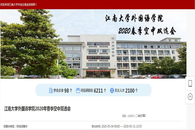 借助学校招生就业网、学院公众号招聘专栏积极推进“云就业”服务工作,推出“2020春季空中双选会”、“学姐求职说”等就业服务活动。