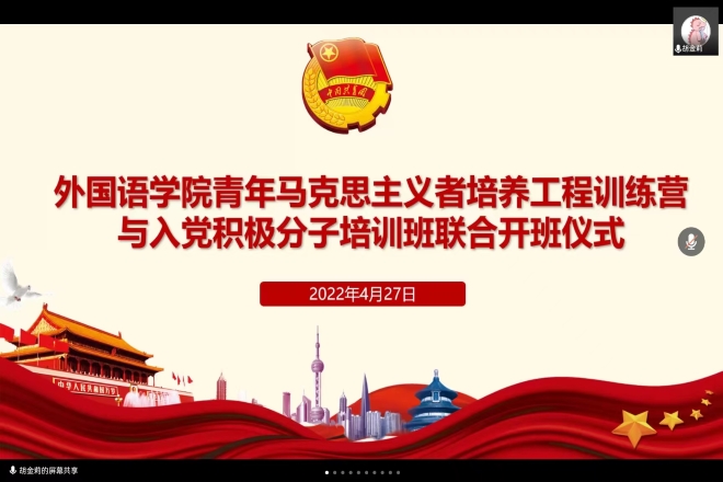 2022年青年马克思主义者培训工程训练营与入党积极分子培训班联合开班仪式通过腾讯线上会议举行,主持人是英语2103班胡金莉。本次开班仪式邀请到天美娱乐官网