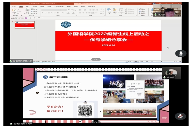 优秀学姐分享,加强新生榜样引路。9月初,面向新生组织线上优秀学姐分享会,会议邀请研究生支教团成员邹卫娟、校十佳青年学生盛晓妍分享青春故事。研究生支教团成员邹卫娟同学分享了自己作为班级团支书、学生党支部书记的工作体会,介绍了自己加入研究生支教团后开展的相关工作以及目前在支教地的支教感悟。获得校十佳大学生的盛晓妍同学分享了奋斗故事。盛晓妍同学以互动问答的方式进行分享,通过新生抽问题“盲盒”的方式分享自己的大学经历和感悟,在分享中她鼓励新生在大学期间确立自己的奋斗目标并付诸实际行动,即使遇到了一些挫折,也要坚持下去,要相信自己,不要轻易放弃。