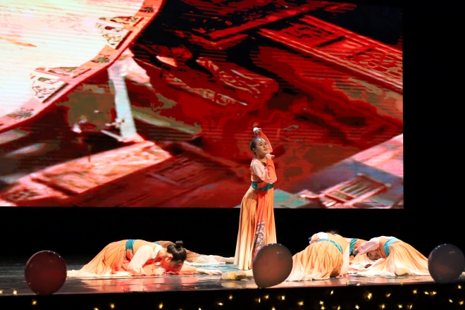 晚会由狂花乐队表演的《言って》开场,气氛热烈,燃爆全场。第一篇章淡墨韵景忆长安:由艺术团带来的民舞《唐印》,舞姿优美,唐韵悠长;器乐《寻你》除了学生的乐器表演,还邀请了江南大学厨师王磊带来萨克斯演奏,现场掌声雷动;话剧《白蛇前传》由外院星月剧社表演,他们将英语融入历史背景,幽默诙谐的风格让观众笑声连连;戏曲《锁麟囊》带领大家走进程派京剧,感受到了中华传统文化的魅力。第一篇章结束,学院副院长顾琦一颁发幸运抽奖三等奖。
