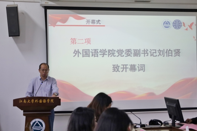 开幕式伊始,全体起立,奏响国歌。随后,学院党委副书记刘伯贤致辞。刘书记的话语中寄托了对同学们的殷切希望。他对青年学生提出了更高的要求,希望大家不负伟大时代,求实创新,勇挑重担。广大青年学子要认真学习文化知识,提高整体素质,身体力行的践行社会主义核心价值观,争当知中国、爱中国、堪当民族复兴大任的新时代“外语人”。