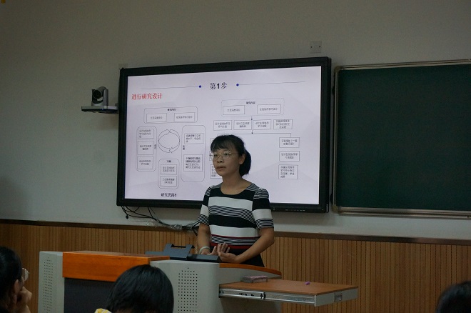 王靖博士从“教学”与“研究”两个关键词切入,将自己的教学研究实例——“促进交互深度的在线协作学习设计研究”分解和总结为“两个阶段”、“十步走”的教学研究范式,深入浅出、生动形象地诠释了如何进行教学研究的设计与实施。她先从教学中的困惑入手,与在座教师分享交流教学中的问题与建议,从而介绍如何一步一步迈进教学与科研相互促进、良性循环的轨道。