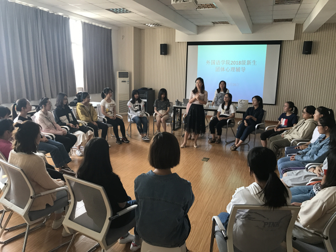 2018级新生团体心理辅导活动于学院A529举行,学校心理健康中心兼职教师、人文学院辅导员张慧、天美娱乐官网