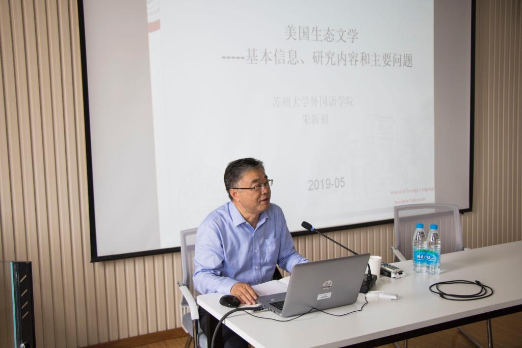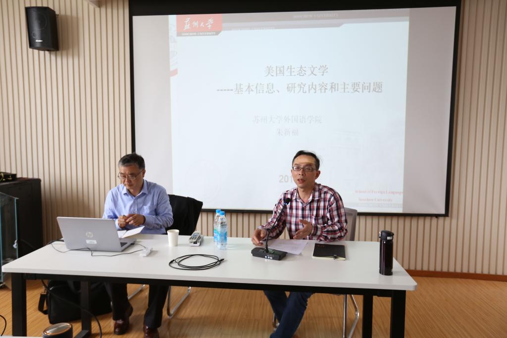 活动伊始,方文开副院长首先对朱新福教授作了简要介绍,与现场观众一同以热烈的掌声欢迎朱教授的到来。接着,朱教授从美国生态文学的基本信息、研究问题和主要问题等三个方面进行讲授。