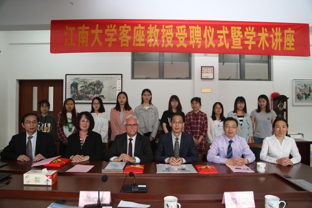 5月15日,德国勒沃库森市储蓄银行前总裁等人来访江南大学。此次来访,曼弗雷德·赫博斯海姆先生(Manfred Herpolsheimer)受聘为江南大学客座教授,并给予了同学们一场精彩的报告。15日下午受聘典礼在天美娱乐官网