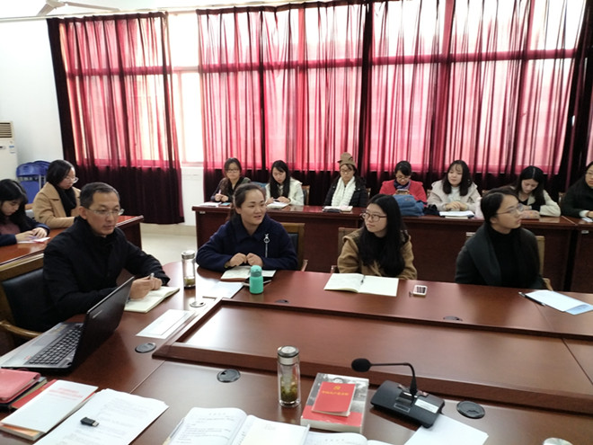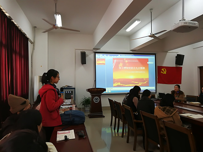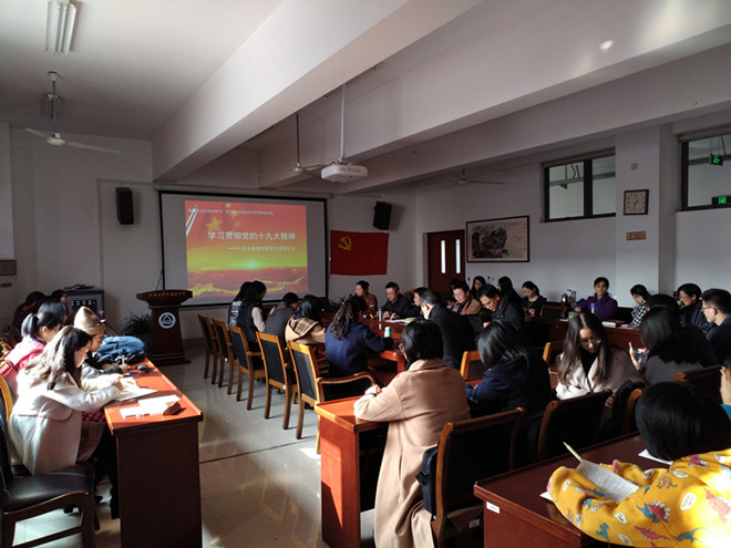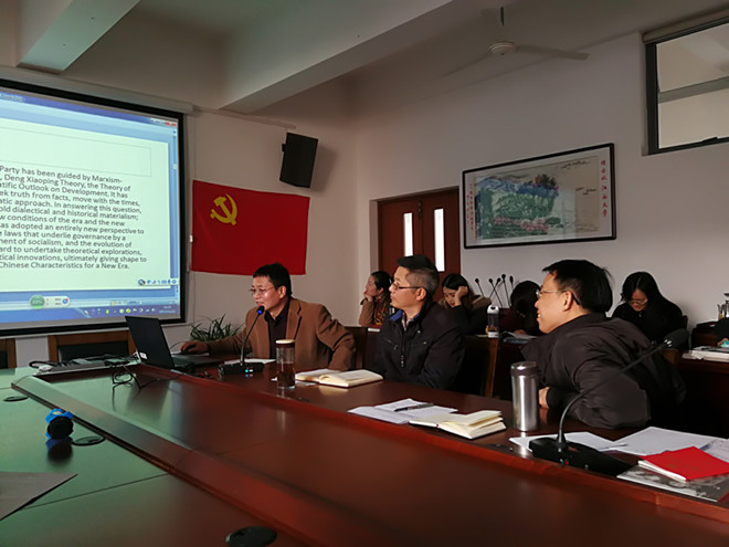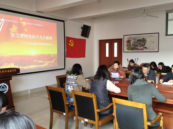 师生共建党支部进行新一轮的政治理论学习,英语系教工党支部与2014-2016级本科学生党支部全体党员在A349举行“学习党的十九大精神——十九大报告英译交流研讨会”。
