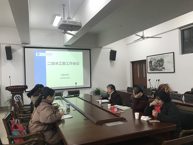 二级关工委工作会议于2018年1月3日下午2:00在学院楼A349顺利召开。学院关工委主任赵莹,副主任张晓虹,鲍国庆、吴艳敏、许广玉等全体委员参加了此次会议。会议由关工委主任赵莹主持。
