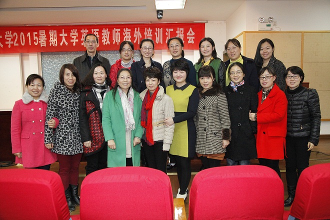 11月25日下午,“江南大学2015暑期大学英语教师海外培训汇报会”在文浩馆205报告厅如期举行。人事处张影陆处长、国交处钟芳处长、教务处曹栋处长、学院龚晓斌院长、黄城芳书记、李健雪副院长以及天美娱乐