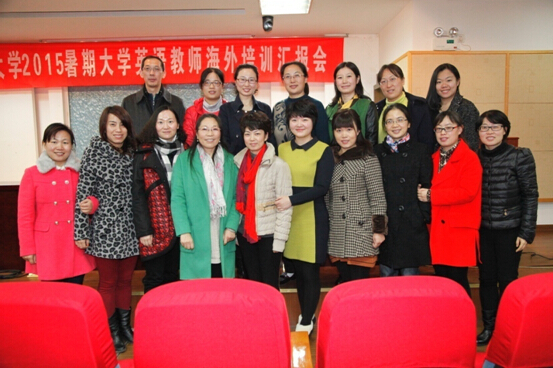 11月25日下午,“江南大学2015暑期大学英语教师海外培训汇报会”在文浩馆205报告厅如期举行。人事处张影陆处长、国交处钟芳处长、教务处曹栋处长、学院龚晓斌院长、黄城芳书记、李健雪副院长等以及天美娱乐