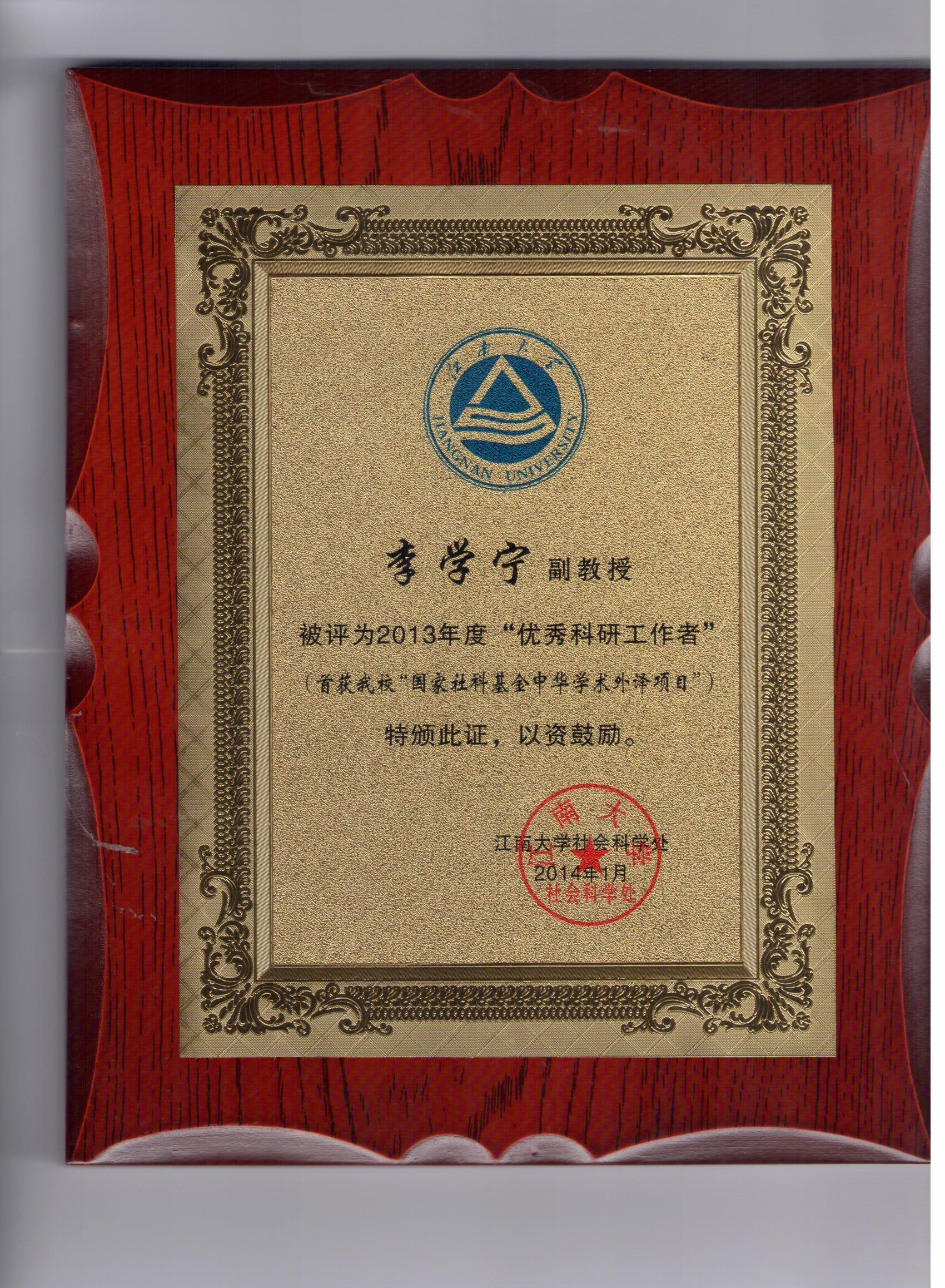 从刚刚召开的我校科研工作会议上获悉,天美娱乐 李学宁副教授被学校评为2013年度“科研优秀工作者”,其研究项目“爱与思——生活儒学的观念”—首获我校“国际社科基金中华学术外译项目”。