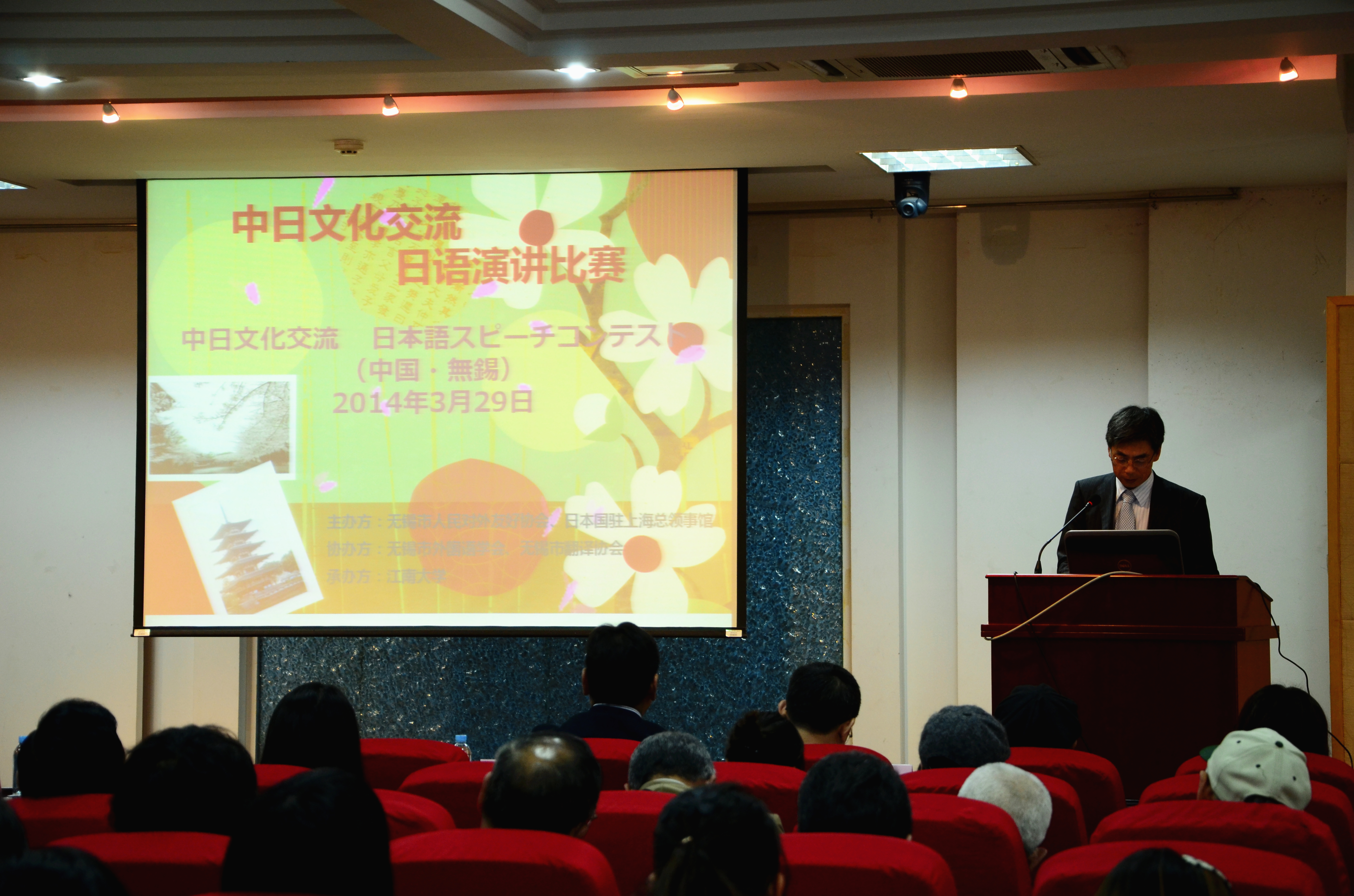 2014年3月29日上午10时,由无锡市人民政府外事办公室和日本国驻上海总领事馆主办,无锡市外国语协会、无锡市翻译协会协办,江南大学承办的中日交流日语演讲比赛决赛于文浩馆拉开序幕。驻上海日本总领事小原雅博、江南大学副校长徐岩、无锡市人民对外友好协会会长王锡南、秘书长许睿煜出席了本次比赛。