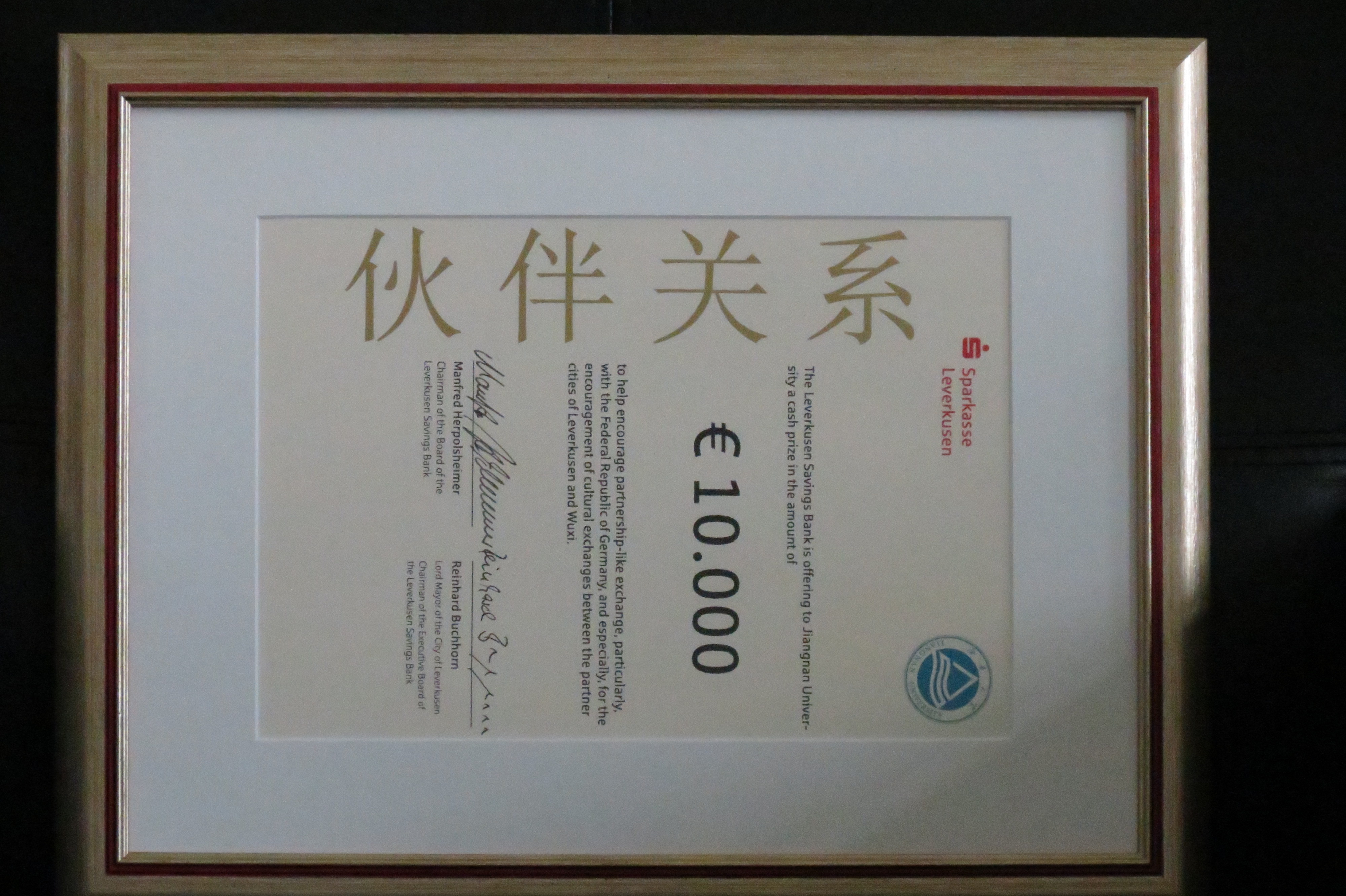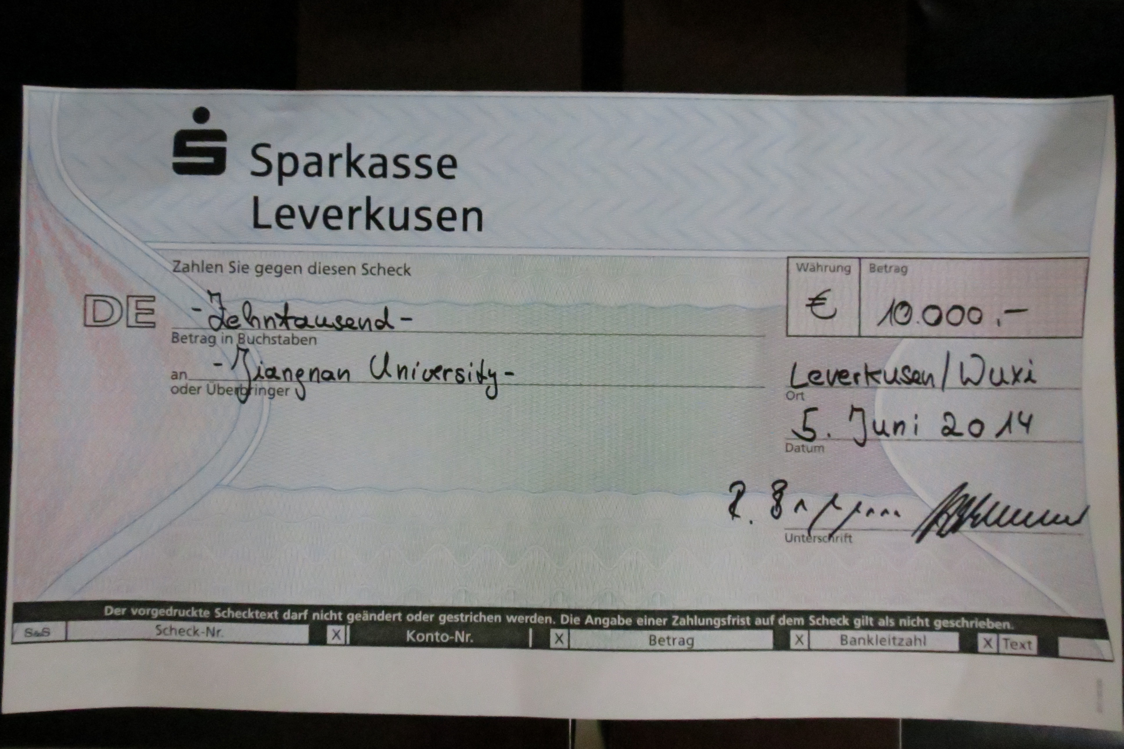 2014年6月5日,由市长莱茵哈德·博鸿(Reinhard Buchhorn)率领的德国勒沃库森市政府和企业家代表团一行到访无锡,与无锡市续签友城协议。省委常委、市委书记黄莉新、市领导张叶飞、嵇克俭在无锡市市民中心一号楼会见了德国客人。勒沃库森市代表团此次来锡访问,意在推进两市教育界的交流合作,促进两地企业之间的经贸往来。在友城协议续签仪式上,勒沃库森市代表团主要成员之一勒沃库森储蓄银行董事会主席首席执行官曼弗雷德·赫博斯海姆(Manfred Herpolsheimer)先生以个人名义向江南大学外语学院捐赠教育交流经费1万欧元,用于天美娱乐官网-天美娱乐TIMI CASINO