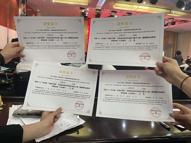 江南大学代表队“102商英小队”在江南大学初赛中脱颖而出,代表学校参加复赛。在谢晴和朱敏华老师的精心指导下,参赛选手赛前进行了充分的准备和演练,包括前期的微视频制作、赛前的PPT设计以及打磨熟记演讲稿,最终选手们在视频制作、知识竞赛以及现场赛中表现优异,获得省级复赛(江苏赛区)二等奖。此次比赛锻炼了参赛学生的英语应用能力、跨文化交际能力和“商务+英语”的复合型能力,同时也为培养学生提高商务英语综合素质、以赛育人、思政育人以及商务英语课程教学留下宝贵经验。