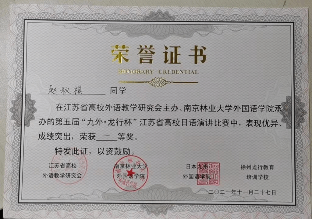 此次因疫情原因,我校选手通过线上参加比赛。初赛为命题演讲,我校选手赵秋棋同学日语水平扎实、发音优美、演讲内容紧扣主题,发挥稳定,以个人第二的成绩进入决赛。决赛即兴演讲环节赵秋棋同学抽到第一位出场,仍凭借较强的临场发挥能力和良好的心理素质,获得了此次大赛的一等奖;中西由美子老师和吴颖老师获得优秀指导奖。