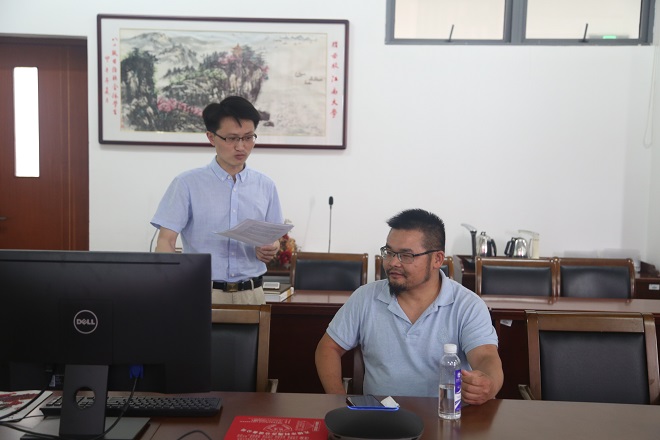 朱义华副院长主持,学院留学海外一年以上且有意向申报国家社科基金中华学术外译项目的十余位老师现场聆听了讲座。因防疫工作需要,现场聆听的老师们佩戴口罩,隔座而坐,其他老师则通过钉钉群视频听讲座。