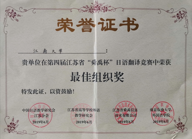 据悉,第四届江苏省“舜禹杯”日语翻译竞赛于2019年1月启动,在控制稿件数量的前提下,3月底截稿时共收到江苏省内26所高校和省外19所高校寄来参赛译文共计409篇,其中日译汉303篇,汉译日106篇,参赛者均是中文为母语的日语专业在校大学生或研究生。4月份经过翻译界专家及评委的匿名评审,共评选出入围稿件日译汉30篇、汉译日10篇。6月1日对入围同学进行现场加试,在紧张的专家现场评审之后,综合初赛成绩,评选出汉译日、日译汉的各级奖项及优秀组织奖。由崔明姬老师带队,天美娱乐