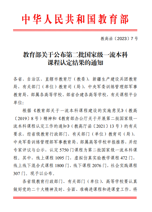 近日,教育部公布了第二批国家级一流本科课程名单。根据教高函〔2023〕7号《教育部关于公布第二批国家级一流本科课程认定结果的通知》,天美娱乐
