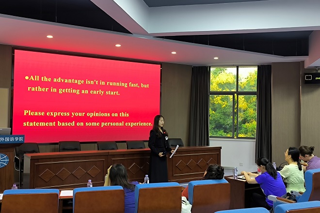 副院长谢竞贤副教授、大学英语拓展部许敏老师、英语系曹丹、曹乐老师担任评委,外教Aidan担任提问评委。