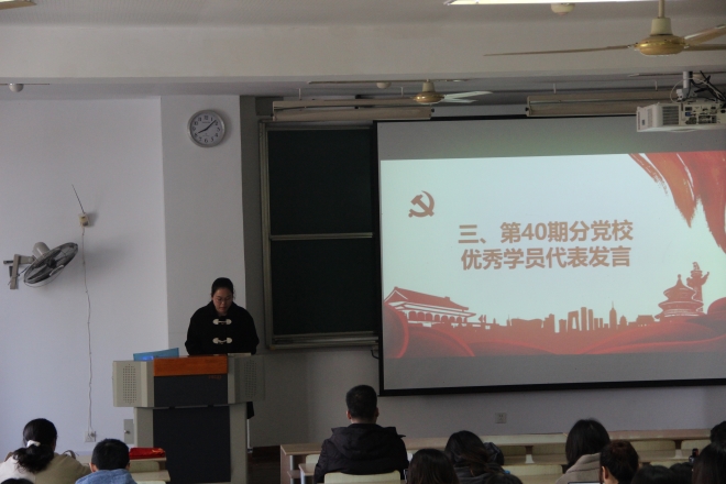 18硕的路丽同学作为上一期优秀学员代表发言。在分享了自己参加40期党校培训的感悟和收获之后,她表明中国共产党既有理论的深度,也有实践的厚度,参加此次仪式的同学们应端正入党动机,认真学习理论知识,明确党章意识,提高党性修养,以党员的标准严格要求自己,在思想和行动上积极向党组织靠拢。随后,上期优秀学员代表向本期学员代表授予党旗,全体学员起立,面向党旗郑重宣誓。开班仪式在陆芳老师布置安排本期培训班的任务和具体要求后圆满结束。