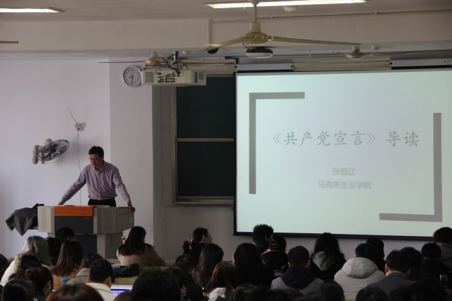 其后,马克思主义学院张祖辽教授为大家带来开班第一讲:《共产党宣言》导读。他以为何要读《共产党宣言》为起点,明确指出:共产主义是马克思主义的落脚点。政治教育的两个目的是培养人的公民意识和民族意识。张教授深入浅出的分析让同学们对共产党员的标准和共产党人的宗旨有了进一步的深刻感悟和理解。在短暂课间休息后,马克思主义学院刘大禹教授为学员们展开第二讲:《以史为鉴,面向未来:学习习近平总书记关于“四史”的重要论述》 。刘教授谈到了自己去台湾的经历感受,深切体会了学习四史的重要性和必要性。四史是党史,国史,改革开放史,社会主义发展史。学习四史,党史是核心。刘教授提到了三个学习四史的重点:总结历史经验,推进革命和改革经验;吸收历史养料,建设社会主义现代化强国;肩负历史使命,实现伟大中国梦。