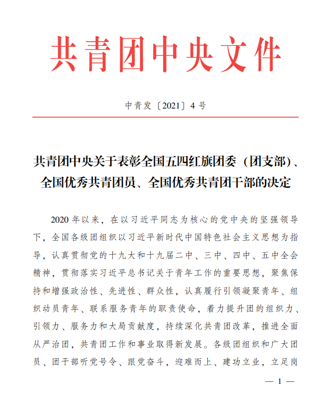 近日,共青团中央发布《关于表彰2020年度“全国优秀共青团员”“全国优秀共青团干部”“全国五四红旗团委(团支部)”的决定》(中青发(2021)4号),天美娱乐官网