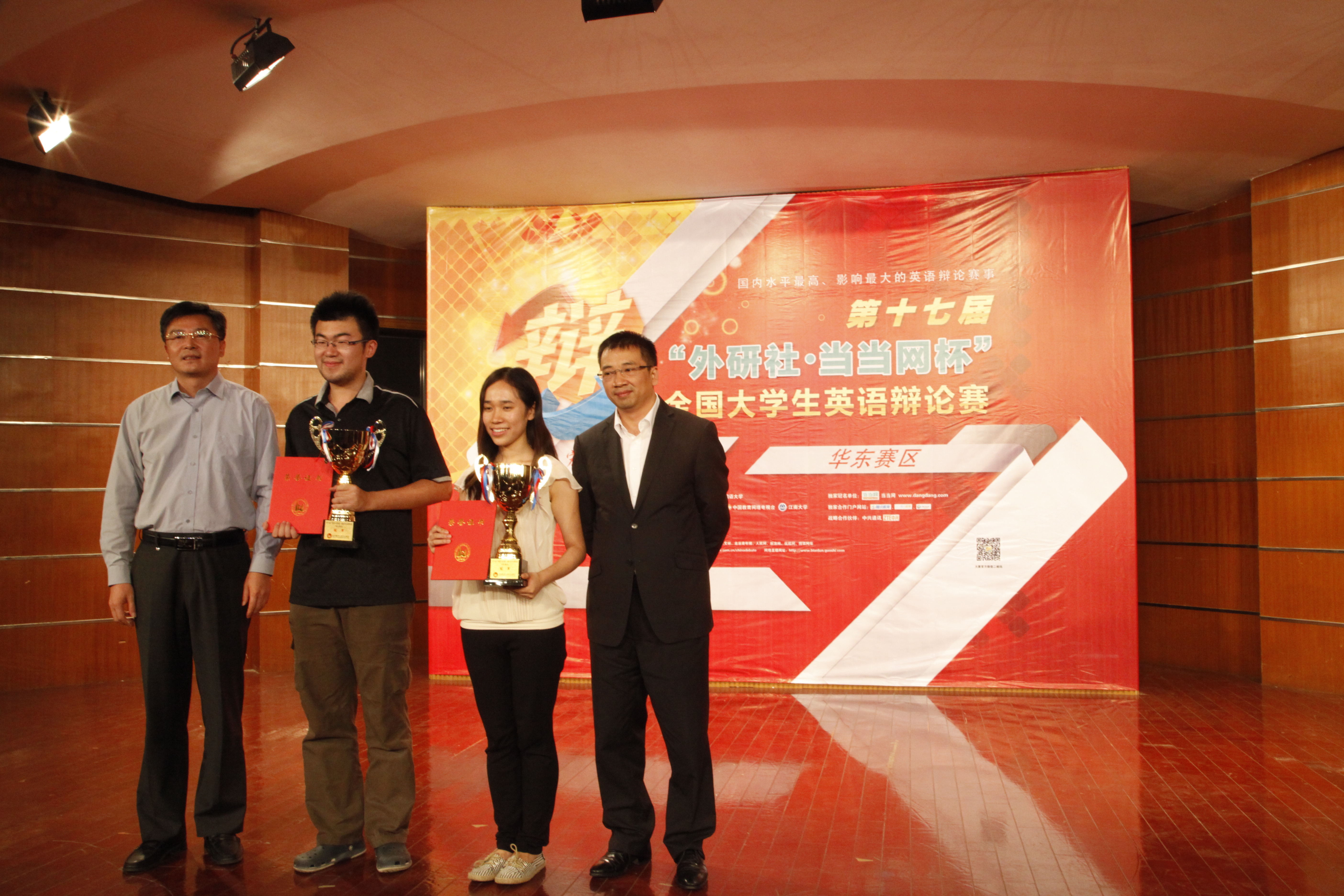 本届“外研社杯”全国大学生英语辩论赛以“辩语青春,论言天下”为主题,倡导广大青年学生以朝气睿智的青春姿态和厚德博闻的天下胸怀,在辩论的舞台上勇于挑战,尽展才华。在此次决赛中,围绕“自由市场能否真正带来自由”的辩题,四支高校队伍的辩手们以绝对实力展开了一场思维的角力与逻辑的交锋。台上辩手思维敏捷、妙语连珠,台下观众全神贯注、掌声不断。经过数天来五轮循环赛的唇枪舌剑和决赛的巅峰对决,最终上海财经大学代表队问鼎华东赛区比赛冠军,南京国际关系学院代表队获得亚军,季军由复旦大学代表队和宁波诺丁汉大学代表队获得。在参与此次大赛的50余支高校队伍中,涵盖了南京大学、上海外国语大学、复旦大学等16支高校代表队表现出色,顺利进军全国总决赛。此次大赛组委会还评出了若干集体奖,其中我校荣膺“优秀组织奖”及“最佳思辨教育推广学校”称号。