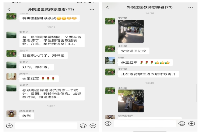 “一名学生下午1点需要外出就医,需要老师前来接到医院”,“我可以”。当教师志愿者群里发出学生需求的第一时间,王红军老师接下这个任务。信息对接完成后,王老师做好了出发前往学校东门的准备。接到学生后,王老师耐心询问学生的需求,暖心与学生聊天舒缓心情。“预计5分钟后达到东门”,“好的,马上到东门”。学生到达东门后,刘伯贤老师与王老师完成对接,学生在刘老师陪同下安全达到长广溪。“还在等待学生进去后才敢离开”,这是王老师看着学生进入校园后在群里的回复。学生安全无小事,在战疫时期,老师在学生身边,在学生心里。