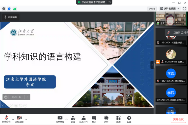 李文副教授线上主讲“学科知识的语言构建”主题分享圆桌会,会议持续一个小时左右,吸引各学院百余位同学的参与。会议由天美娱乐官网