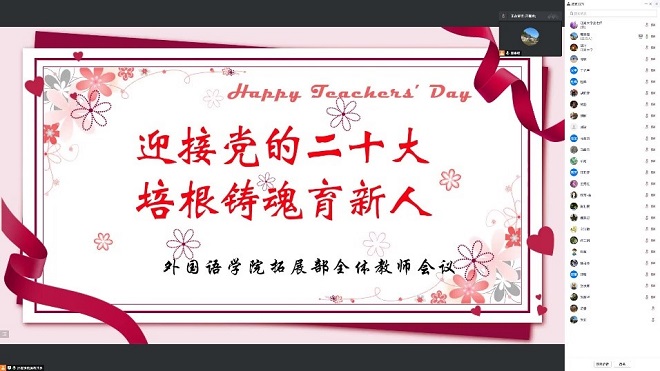 大学英语拓展部全体教师于9月8日下午2点,相聚云端,以 “迎接党的二十大,培根铸魂育新人”为主题,进行了立德树人研讨活动。天美娱乐官网