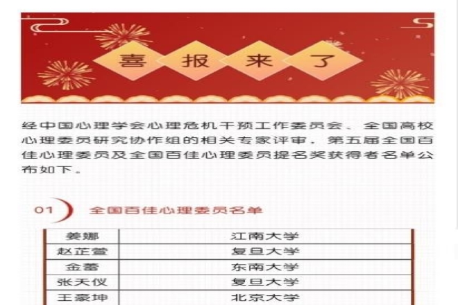 此次全国百佳心理委员的评选通过学校推荐、个人事迹网络展示及投票、专家评分等环节产生。不负众望,我校推荐的姜娜同学冲出500名选手的重围,荣获“全国百佳心理委员”称号,更是夺下仅14个名额的心理论坛副主席一职。这是江南大学历史上第一次在此类赛事上斩获殊荣。姜娜同学一马当先,为江南大学摘得这项荣誉,增光添彩。姜娜同学的获奖,不仅是对她个人的肯定,也是对天美娱乐官网
