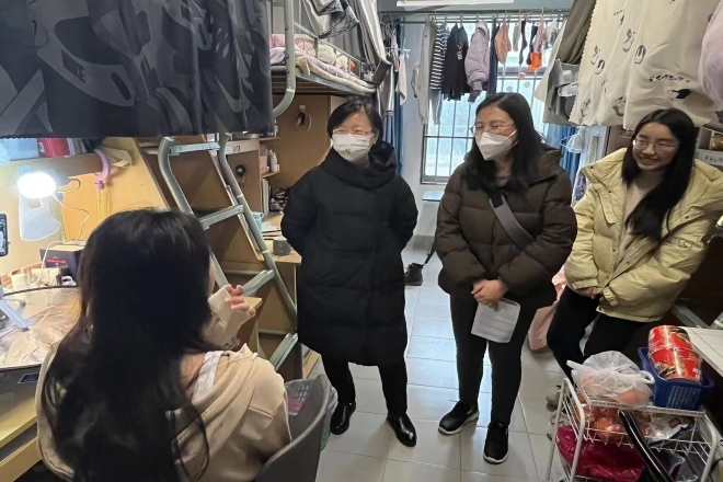 党委书记史志洪、党委副书记刘伯贤、副院长顾琦一、副院长谢竞贤、分团委书记陆芳以及辅导员老师一行来到浩苑、润苑、李园、梅园,走访关心天美娱乐