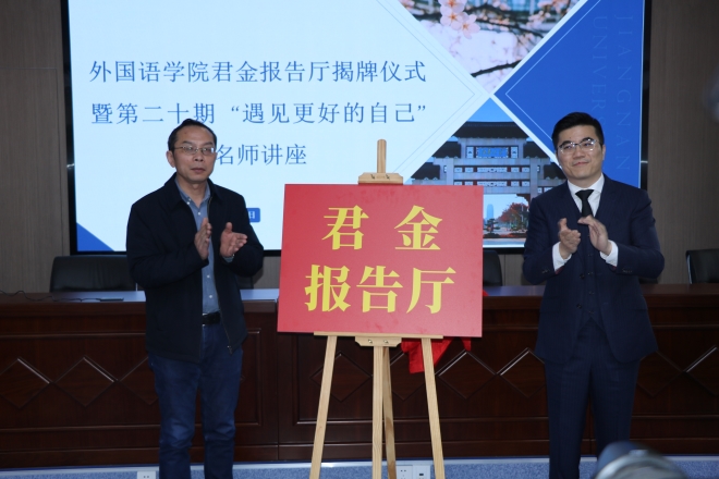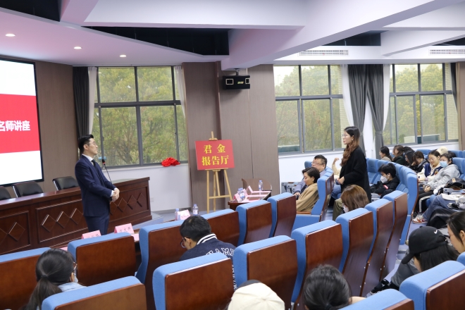 举行君金报告厅揭牌仪式暨第二十期“遇见更好的自己”名师讲座活动。江苏君金律师事务所创始人葛俊君、鑫展集团董事长张晓秋、学院院长方文开、学院社会服务部主任程方以及学院155名学生参加了本次活动。活动由学院党委副书记、副院长刘伯贤主持。