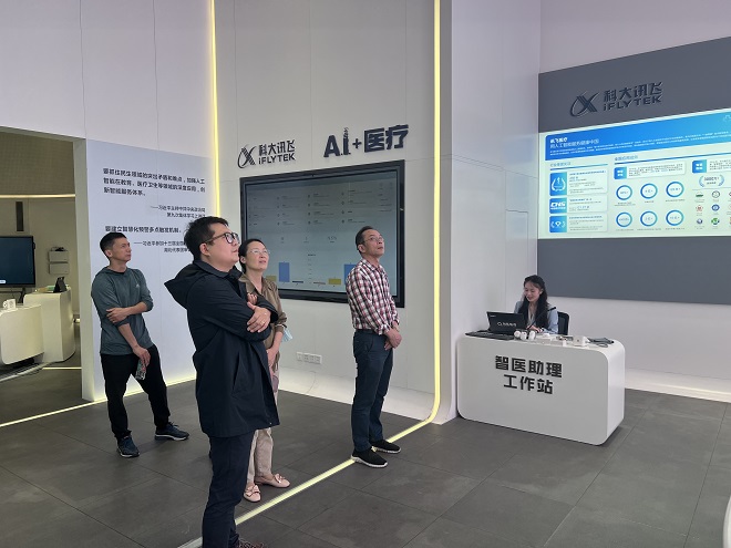科大讯飞教育事业群高教产品线销售总监段鹏举、大区高教行业总监张永坤等对调研组表示热情欢迎,陪同参观了科大讯飞的人工智能体验馆,现场体验科大讯飞的多项人工智能技术,包括语音识别、语音合成、语义理解、自然语言处理等。随后,调研组与科大讯飞研发团队进行了座谈。袁婉君经理做了“通用人工智能助力外语教学数字化转型与高质量发展”的深度分享,双方就人工智能的发展趋势、应用领域、技术挑战等问题进行了深入的交流和讨论。方文开对科大讯飞在人工智能领域的深厚技术积累和创新能力表示了高度赞赏。他表示,通过此次座谈对人工智能有了更深入的理解,也为人工智能融入科学研究、外语教学、人才培养和专业发展提供了宝贵的参考,希望通过这次交流,加强校企合作,共商外语专业改革和人才培养质量提升。