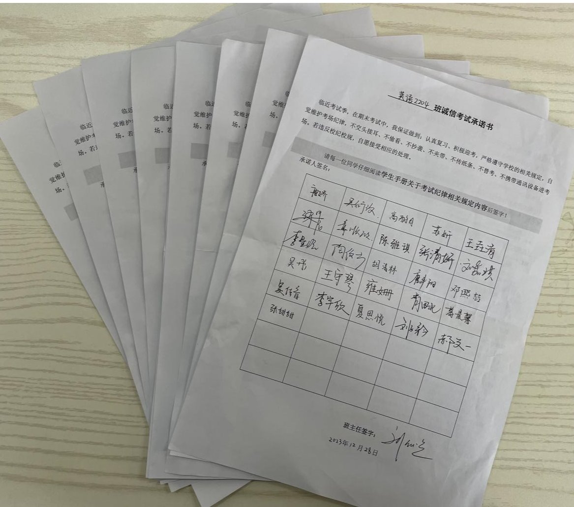 各年级召开了学习委员会议,年级辅导员老师结合学校、学院考试要求,强调在考试周大家要增强责任意识,培养个人优秀品质和形成诚信应考的良好氛围。学院组织全体学生签署《诚信考试承诺书》。同时,为确保“诚信考试”深入学生内心,学院利用学院网站、微信公众号等平台积极宣传开展诚信考试教育,让学生真切的认识到诚信考试的重要性。