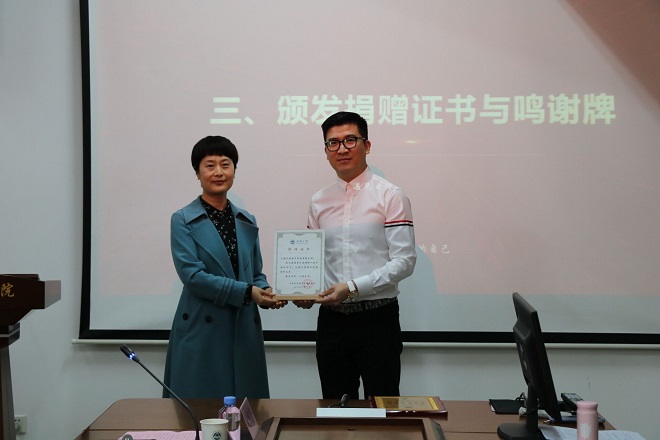于A349会议室举办上海少威电子科技有限公司捐赠仪式暨第二十七期“遇见更好的自己”名师讲座。上海少威电子科技有限公司总经理华锦洲、天美娱乐官网