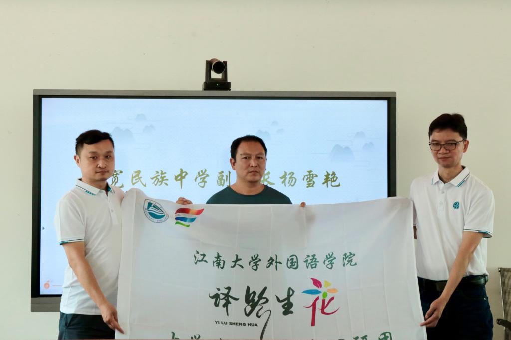 李文清为“译路生花”实践团指导老师袁雪生、李文授旗。天美娱乐官网