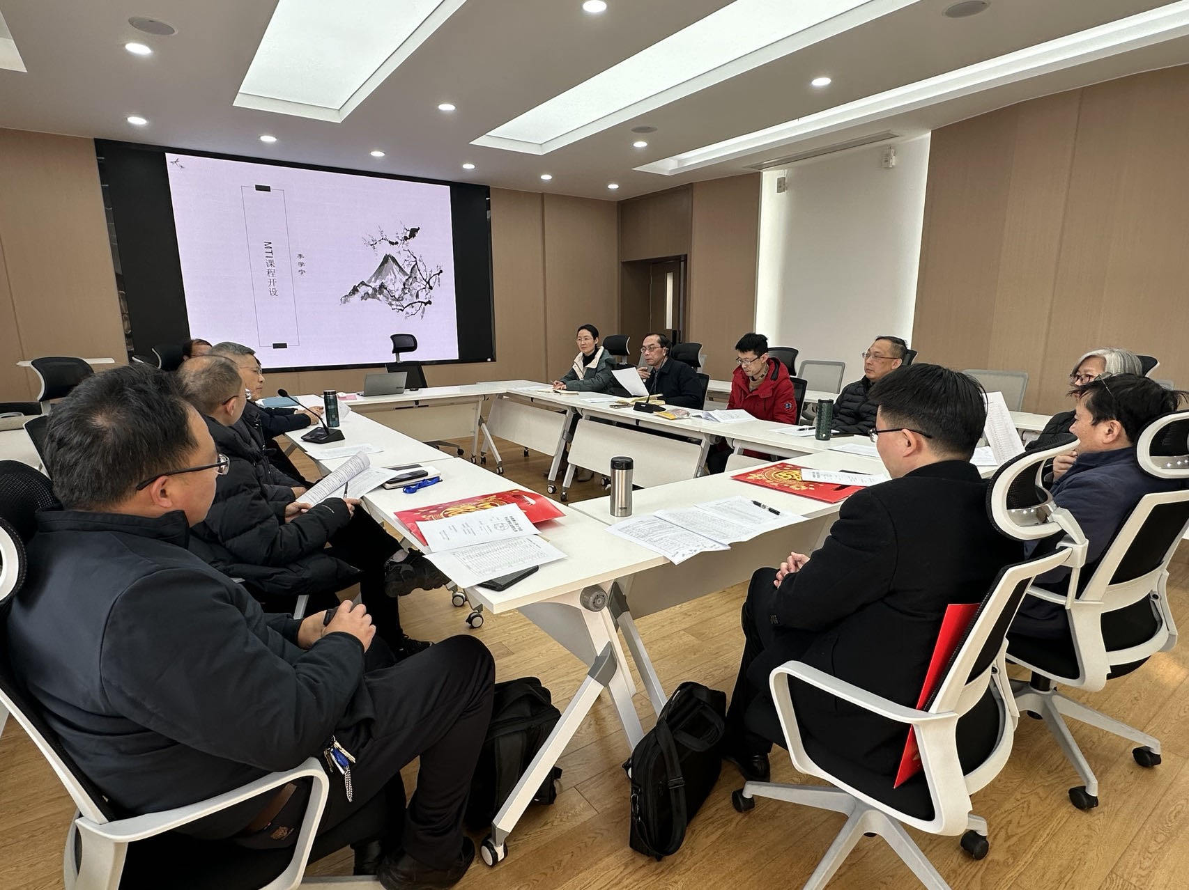首先,谢竞贤副院长介绍了MTI硕士点的申报背景和过程,并对MTI课程计划和申报表做了简要说明,随后李学宁主任详细介绍了开设MTI课程在国家战略发展下的背景、价值和原则,提出了课程开设新思路,及建立红色实习基地等提议。