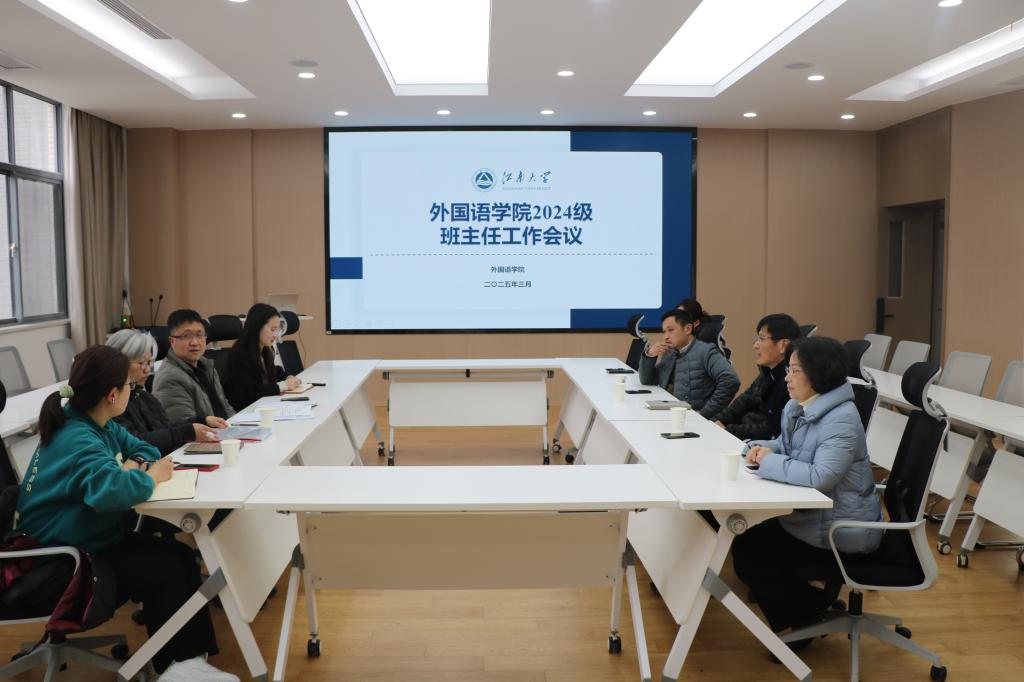 会议伊始,2024级辅导员朱家烨结合课程通过率、平均学分绩点等数据,总结分析了上一学期学生学业情况。季王飞充分肯定了班主任在学风建设中的关键作用,同时指出部分班级存在成绩分层明显、学习动力不足等问题,需通过“分类帮扶”“朋辈辅导”等机制调动学生学习内驱力。顾琦一就新学期班主任重点工作进行部署,明确需结合外语学科特色构建“语言技能+多元能力”培养体系,通过浸润式引导增强学生专业认同感与发展内驱力。