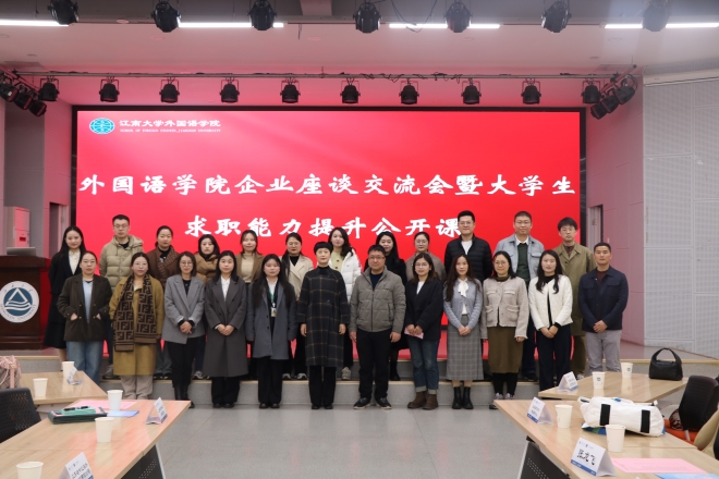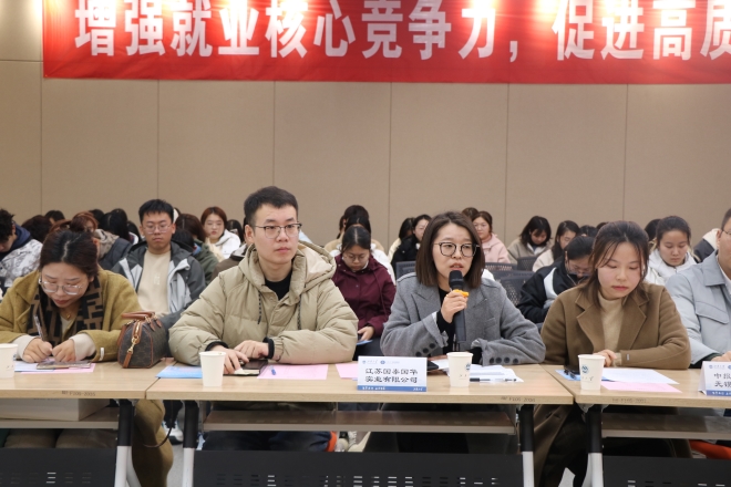 在企业座谈交流环节,各企业代表围绕“提升大学生求职能力”纷纷发言。江苏省中江海外进出口有限公司招聘经理范文倩表示,大学生在校期间要立足专业学习,打造“外语+”的能力,提升个人语言表达能力和解决问题的能力;无锡美迪尔进出口有限公司总经理王涛分享了自身学习经历和创业经历,为准备就业的同学提供了建议;中报国际网络无锡有限公司副总编辑颜玮珏介绍了公司的主营业务,鼓励大家在校期间参与实习实践,希望后期可以和天美娱乐官网