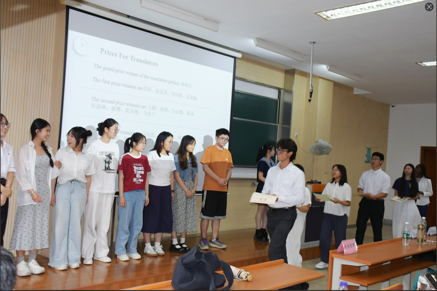 在第一教学楼1B103举办短学期总结大会,全面展示学生在演讲、翻译与跨文化交流方面的学习成果。英语专业2022级、2023级师生、加州大学戴维斯分校(UCD)交流生以及外院教师代表共同参与。