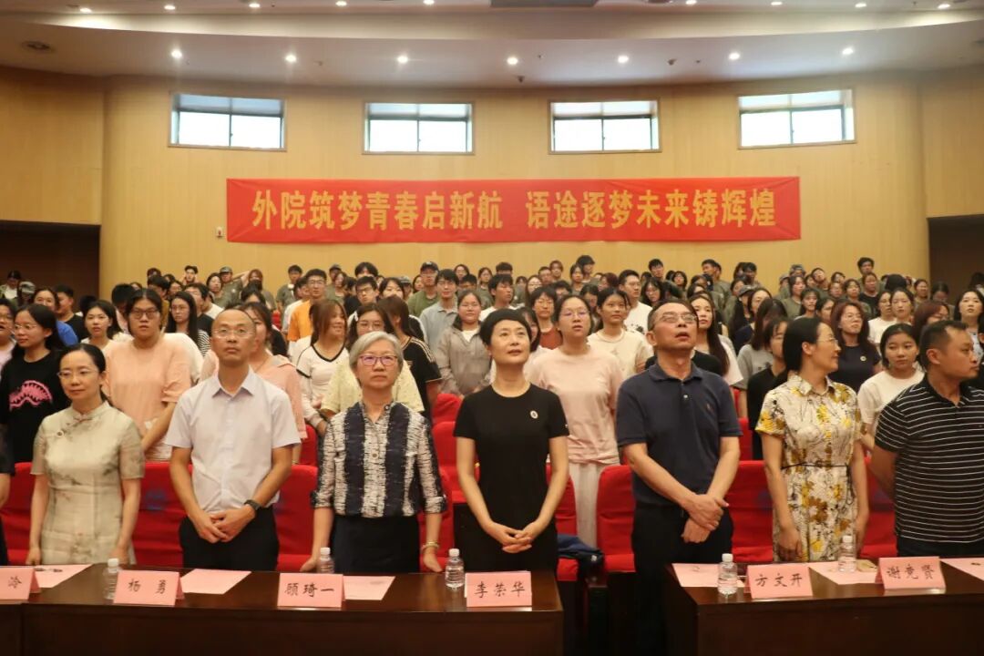 典礼最后,师生齐唱校歌,遒劲的歌声重复着“笃学尚行,止于至善”,掷地有声的话语深入莘莘学子的内心,坚持不懈,知行合一,精益求精从此成为新生学子对未来的追求,外院的历史火炬被同学们紧握,要在拼搏奋斗中践行校歌精神。