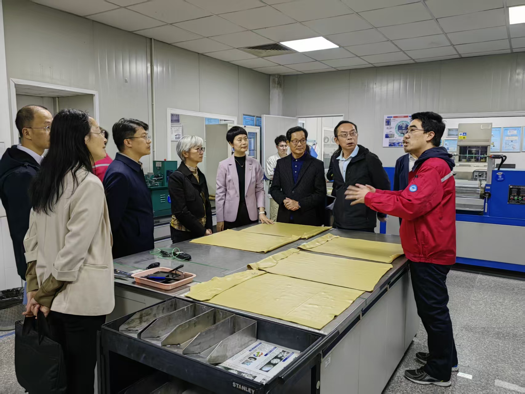 第二站调研团队来到无锡兴达泡塑新材料股份有限公司。公司副总经理包靖虹、行政管理部主任马韵洁陪同参观。作为聚氨酯泡沫塑料行业的龙头企业,兴达泡塑在汽车、建筑、家电等领域拥有广泛市场。在调研中,包靖虹副总经理介绍了公司产品在海外市场的应用情况,强调专业术语翻译的准确性对技术推广的重要性。